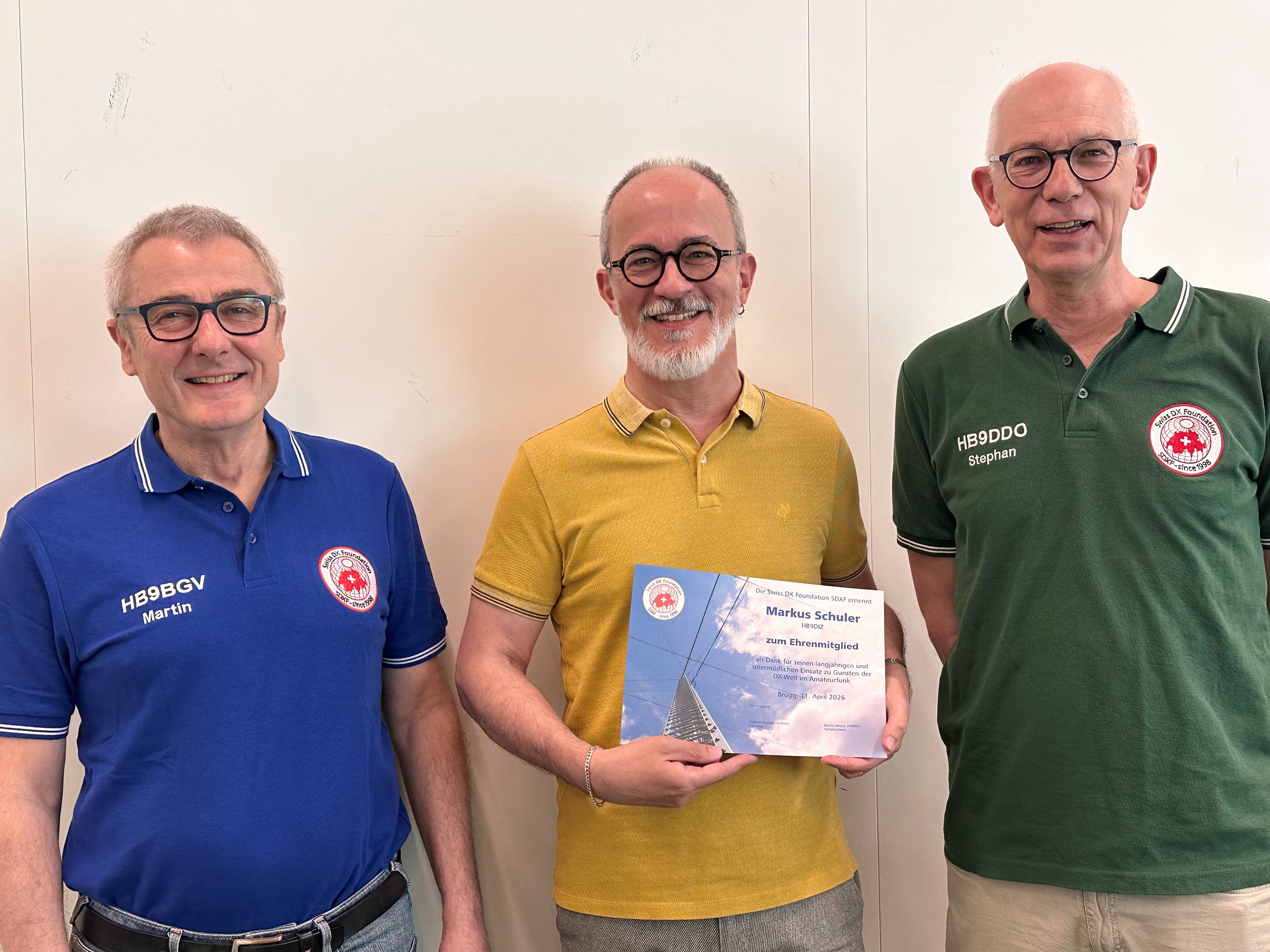 Übergabe der Urkunde zur Ehrenmitgliedschaft an Markus, HB9DIZ durch Martin, HB9BGV und Stephan, HB9DDO
